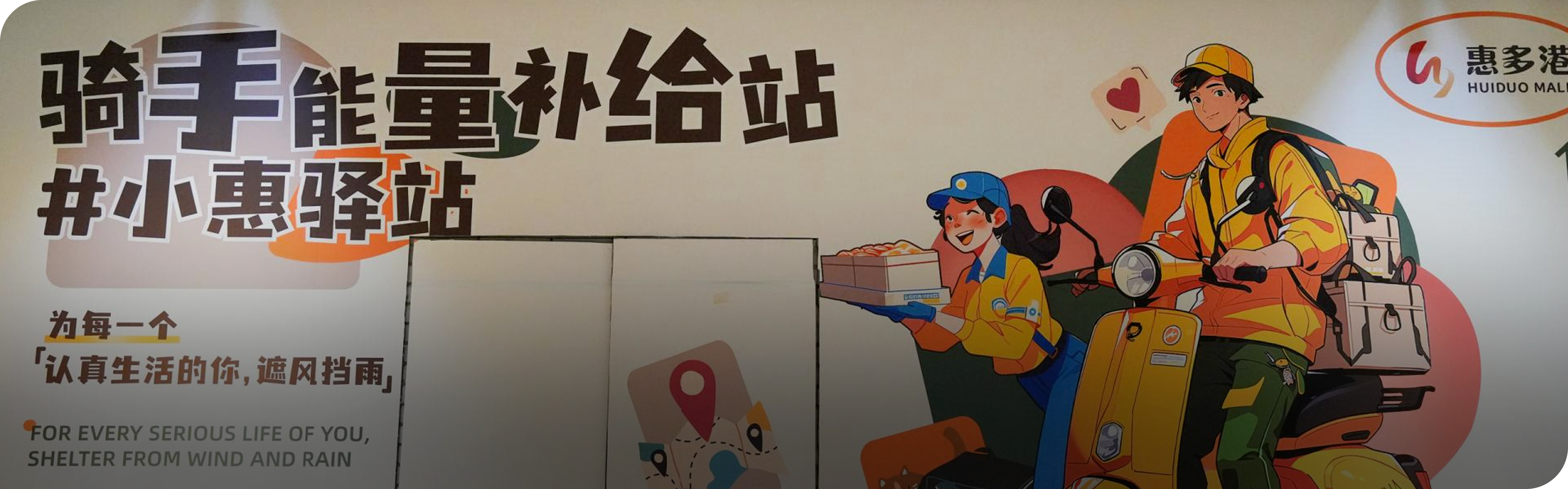 惠多港购物中心针对外卖小哥工作强度大、休息难的问题,专门打造“小惠驿站”休息区,为他们提供临时歇脚场所,展现企业对劳动者群体的尊重与关怀